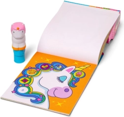 La imagen muestra un libro para colorear y un sello para niños que fomentan la creación creativa.