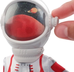 El traje de astronauta detallado con elementos impresos, guantes plateados y botas negras se complementa con un casco de visera transparente para relatos espaciales auténticos.