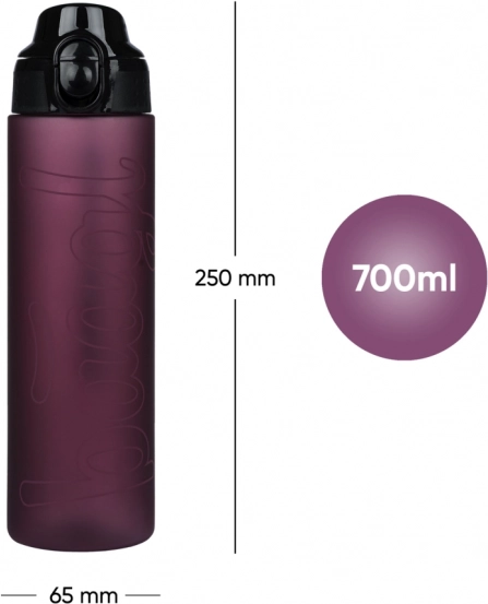 La capacidad de 700 ml en un cuerpo compacto (aprox. 250 × 65 mm) cabe en la mochila y en el portabotellas. Ideal para la escuela y el deporte.