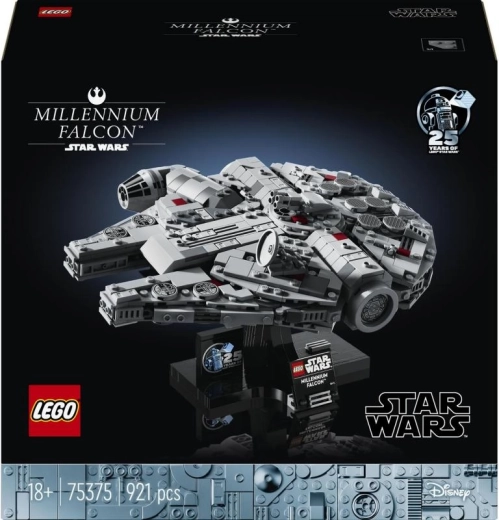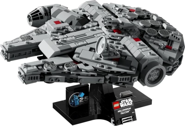 La base estable presenta el Halcón Milenario en vuelo y lo acompaña una placa impresa más un ladrillo del 25.º aniversario de LEGO Star Wars.