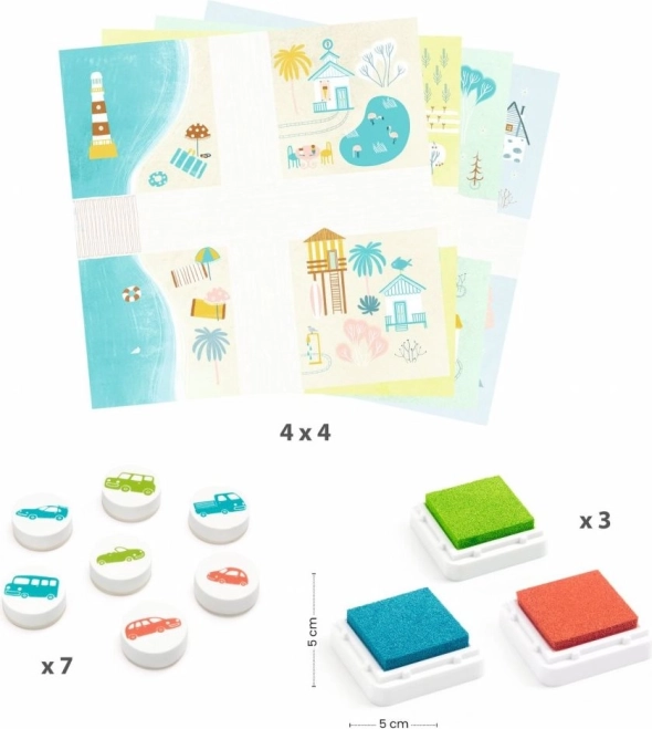 Un set de sellos con motivos de coches que permite a los niños crear imágenes adorables y desarrollar su creatividad.