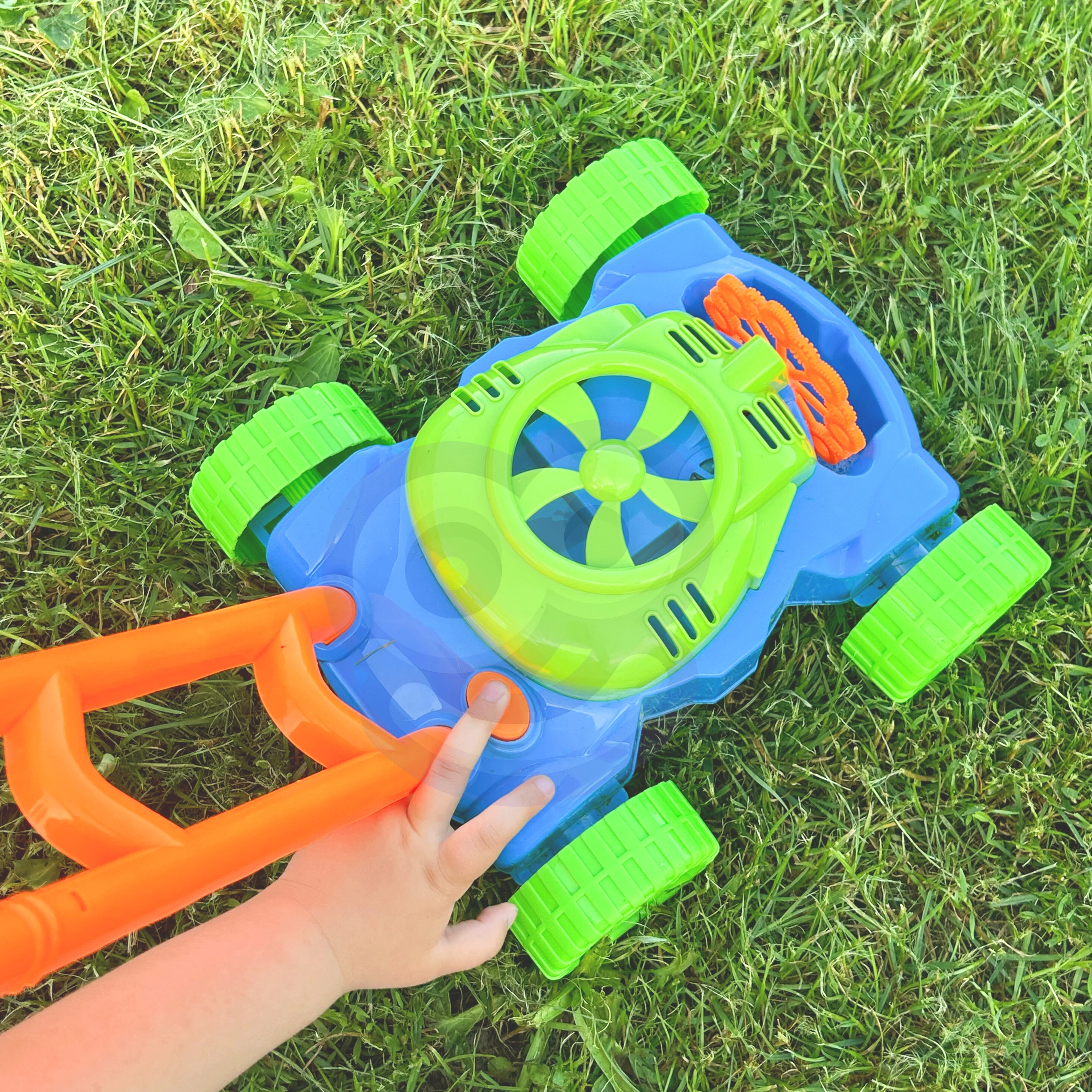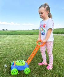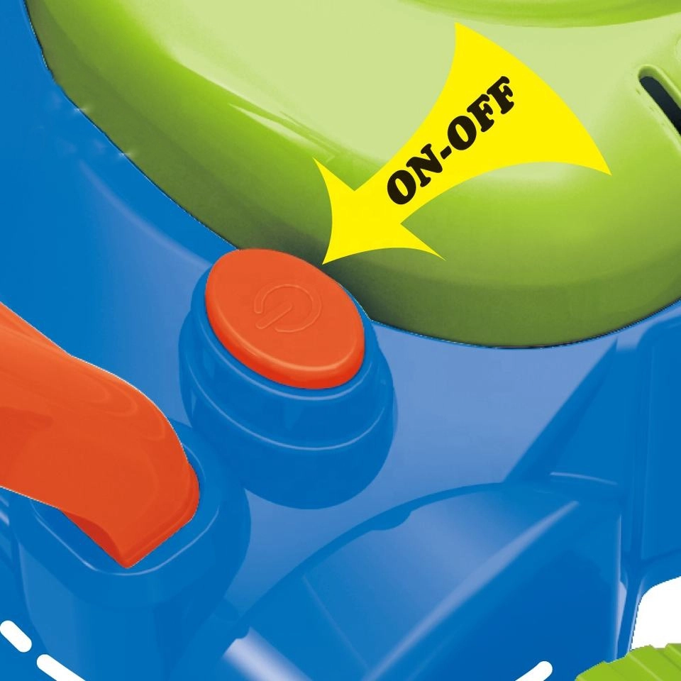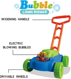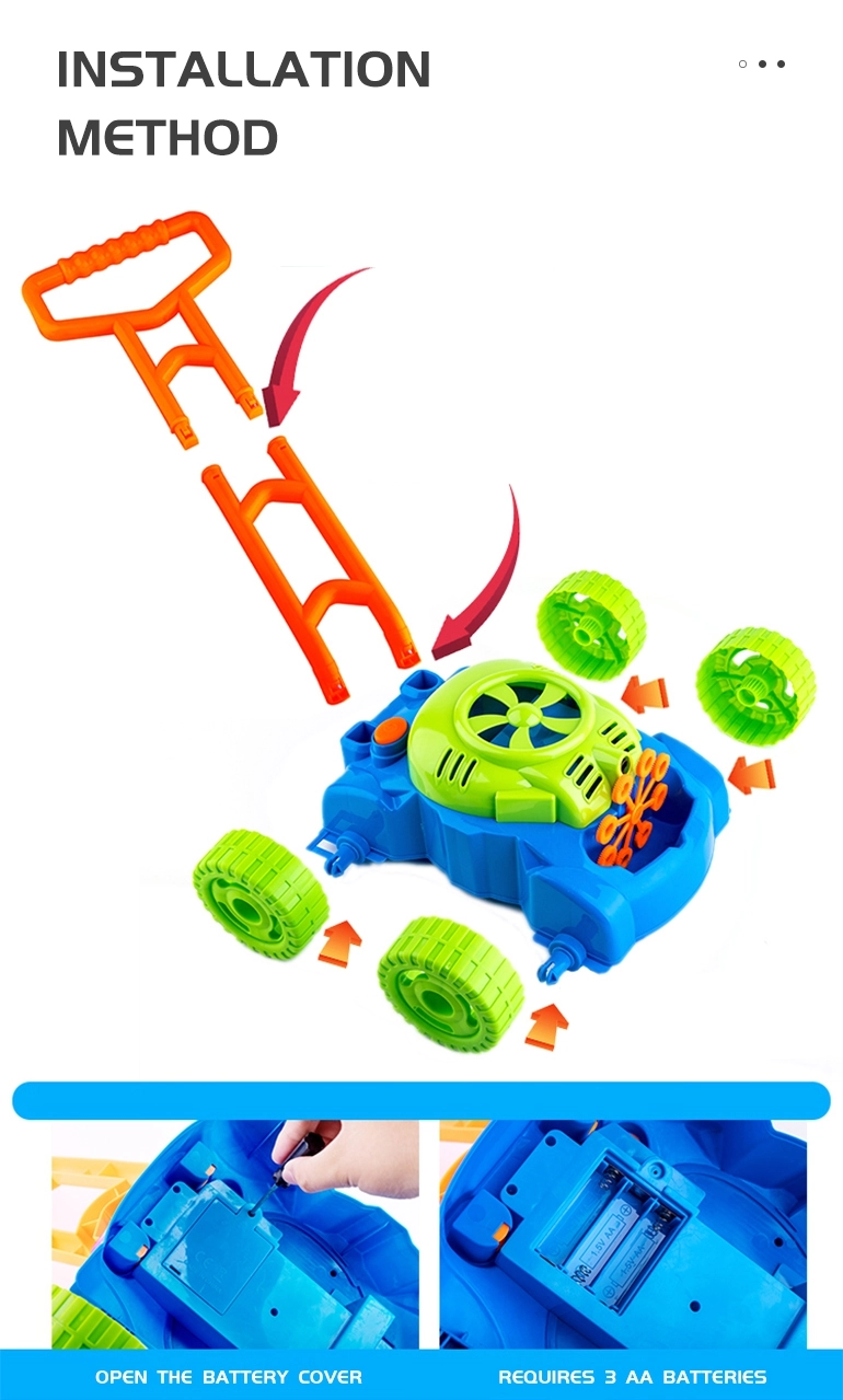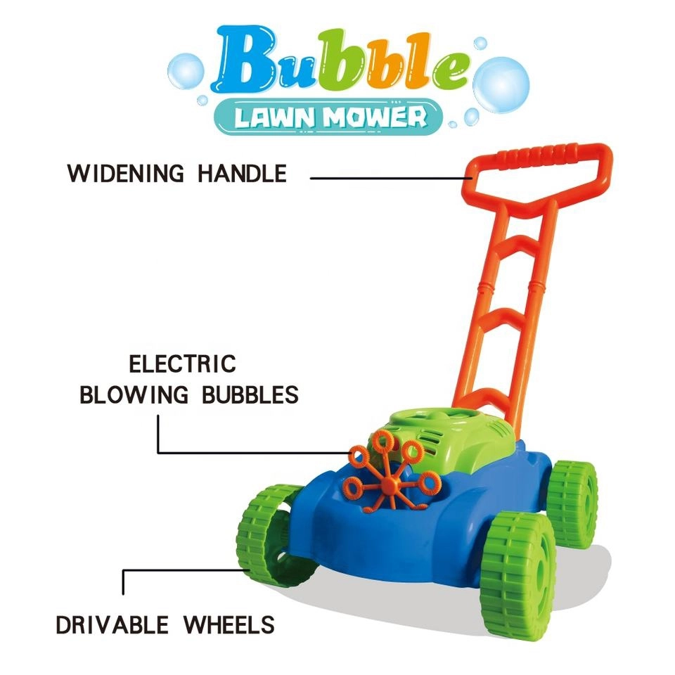 En el interior del cortacésped funciona un pequeño ventilador que impulsa aire hacia 8 anillos giratorios. Estos se van empapando alternativamente en el depósito con líquido y envían las burbujas a través de la boquilla, creando montones de burbujas sin interrupción. Los sonidos de burbujas y la melodía de cuento acompañan y realzan la alegría del juego.