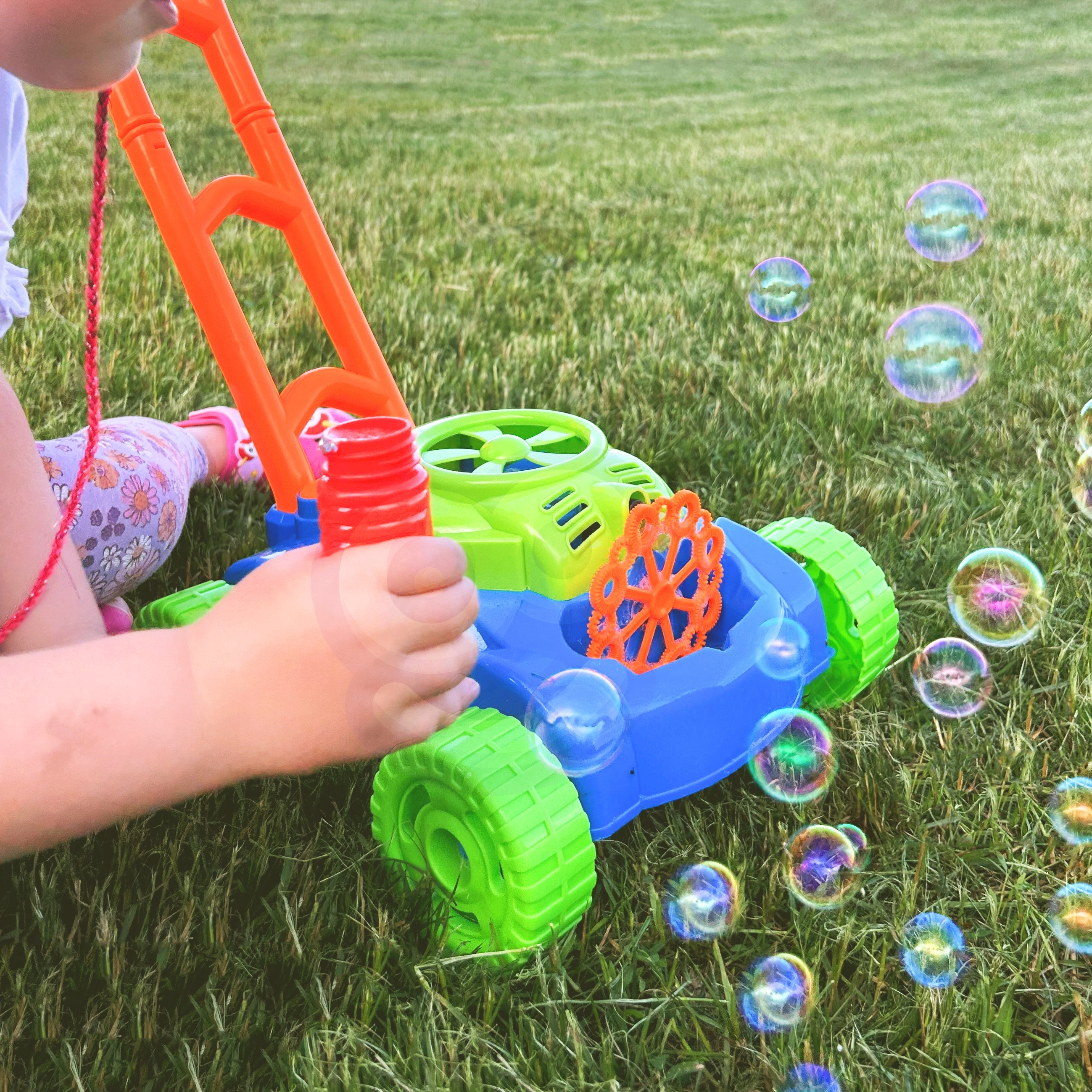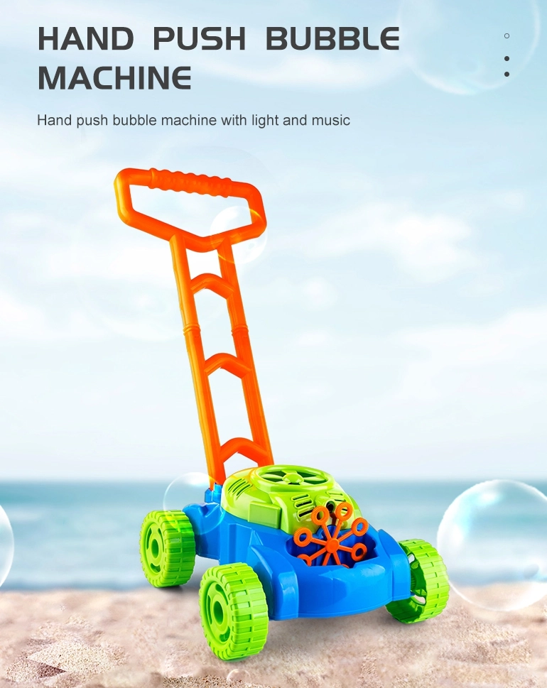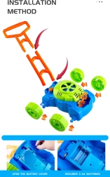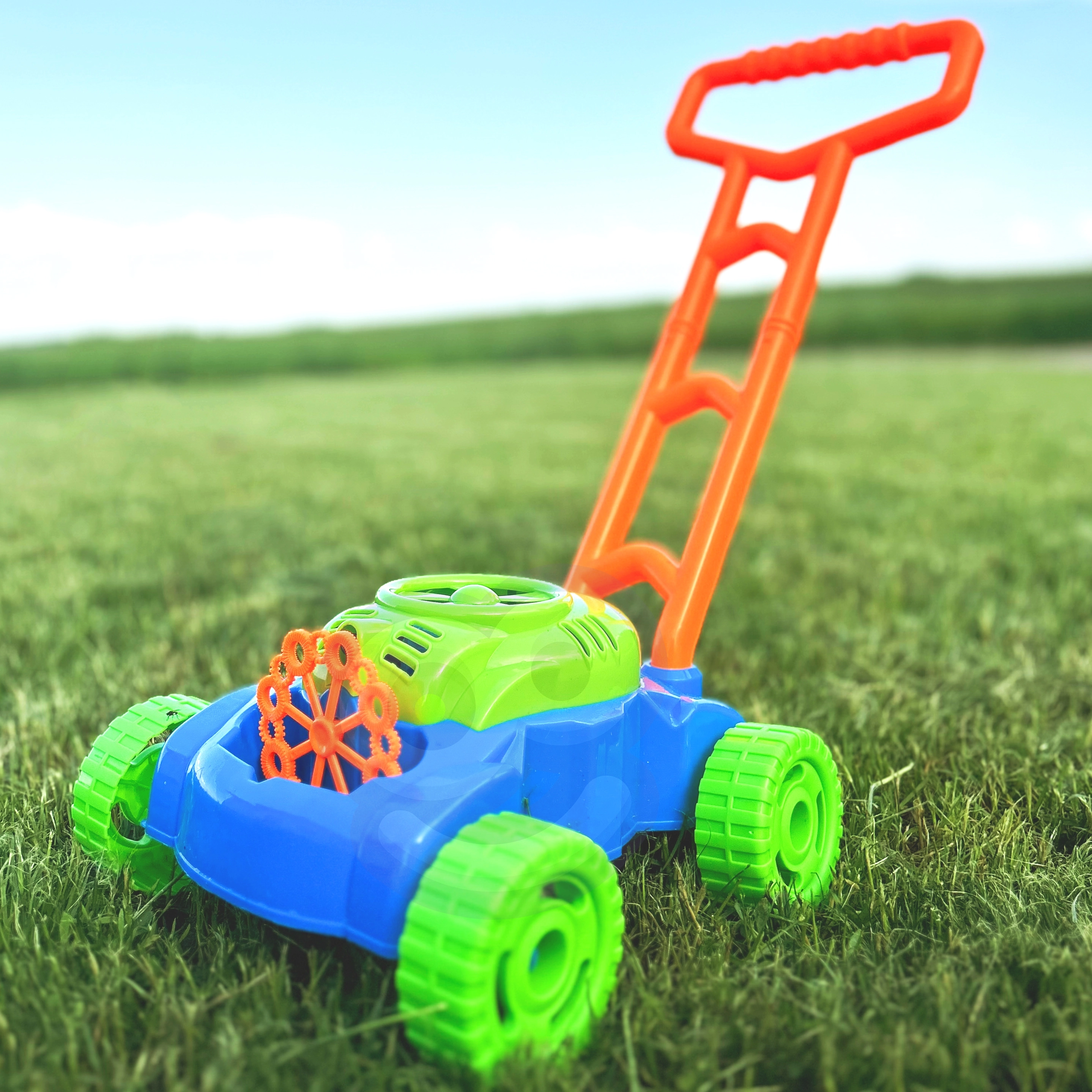 En el interior del cortacésped funciona un pequeño ventilador que impulsa aire hacia 8 anillos giratorios. Estos se van empapando alternativamente en el depósito con líquido y envían las burbujas a través de la boquilla, creando montones de burbujas sin interrupción. Los sonidos de burbujas y la melodía de cuento acompañan y realzan la alegría del juego.