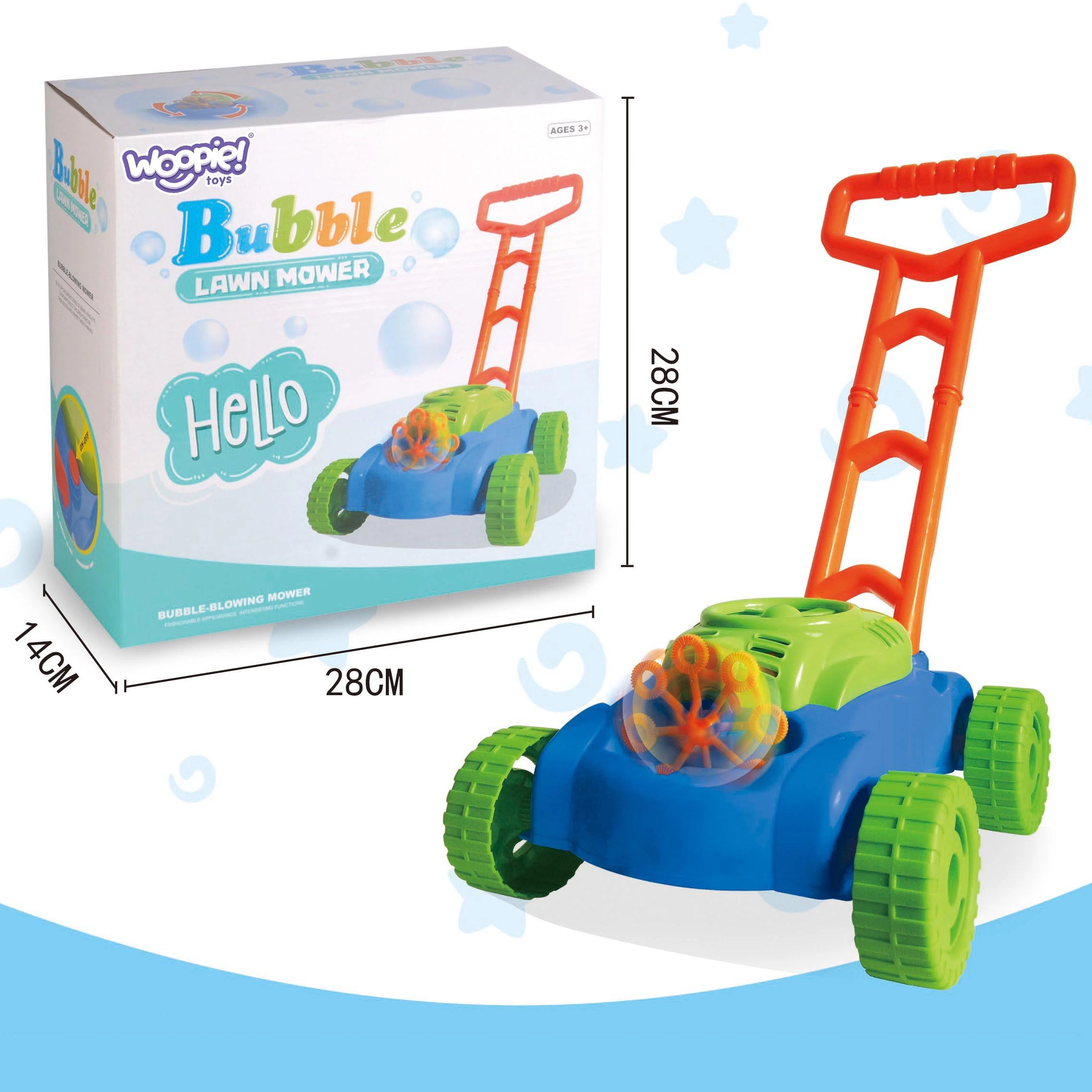 Este colorido cortacésped de burbujas WOOPIE convierte cualquier tarde en el jardín en pura diversión. Gracias al soplado automático de burbujas y al traqueteo realista de las ruedas, los niños pueden imitar fácilmente el trabajo de los adultos mientras practican el equilibrio y la coordinación. El asa estable facilita el empuje y la dirección.