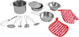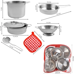 Este set realista de ollas y utensilios metálicos es ideal para cocinitas infantiles y juegos de hogar, bistró o restaurante. El clásico aspecto plateado combina perfectamente con cualquier rincón infantil y la tapa universal se adapta a todas las ollas. Gracias a su estructura ligera y dimensiones compactas, todo el set se transporta y guarda fácilmente.