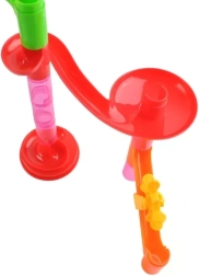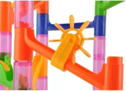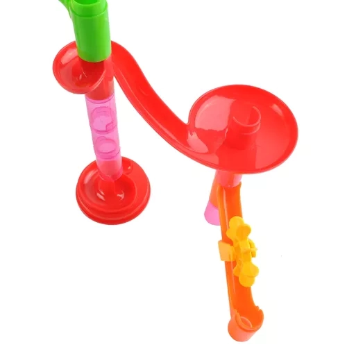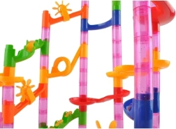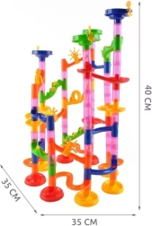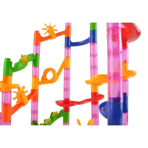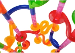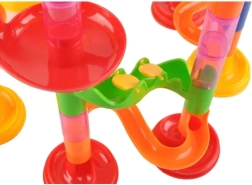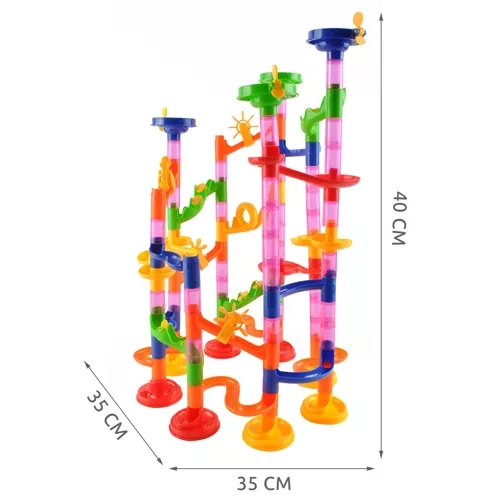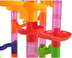 Jugar con la pista desarrolla el razonamiento lógico, la comprensión de la causa y el efecto y los principios básicos de la gravedad y la velocidad. Los niños observan el movimiento de las canicas, prueban diferentes montajes y, al mismo tiempo, refuerzan la paciencia, la creatividad y la motricidad fina.