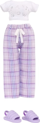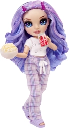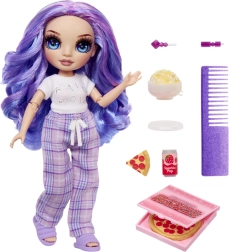 Violet lleva un cómodo pijama morado a cuadros, suaves zapatillas y un set de refrigerios: pizza, palomitas, plato y bebida. Ideal para escenas temáticas y fiestas de pijamas.