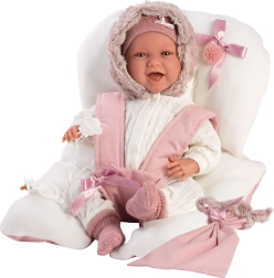 Elegante set para muñecas NEW BORN de 40–42 cm que incluye un conjunto de ropa de 3 piezas con pañuelo decorativo y una base acolchada con lazo y correas, que puede usarse como práctica sillita para la muñeca. La fabricación artesanal en España garantiza calidad y un acabado detallado; el complemento ideal para pequeñas cuidadoras a partir de 3 años.