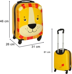 La adorable maleta infantil con motivo de león es ideal como equipaje de mano para pequeños viajeros. Cuenta con un diseño rígido de plástico resistente, cuatro ruedas para un manejo fácil y un asa telescópica. En el interior ofrece dos compartimentos: un bolsillo con cremallera y una sección con correas cruzadas, por lo que caben cómodamente la ropa y los juguetes favoritos.