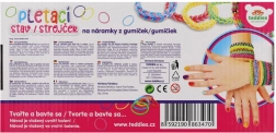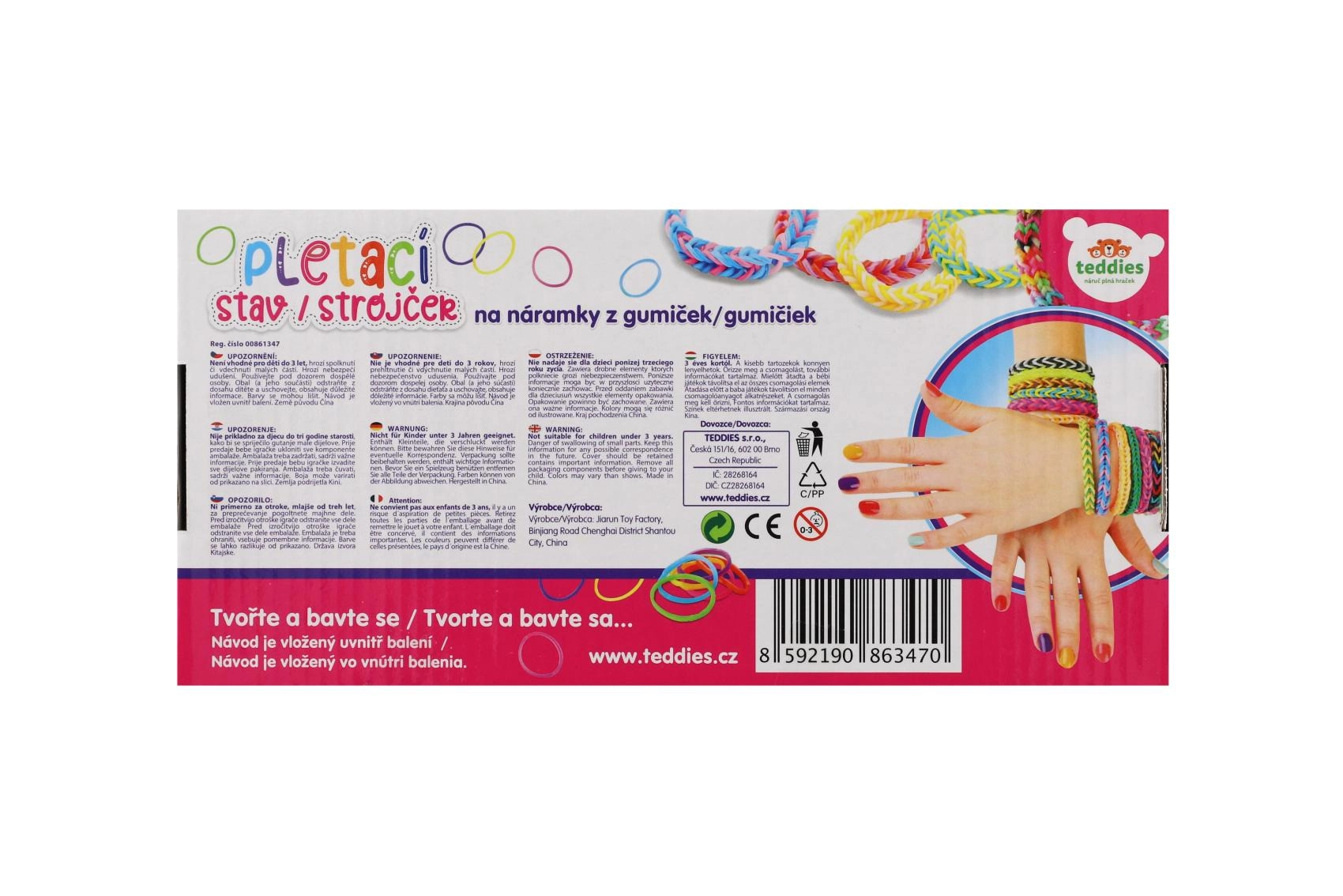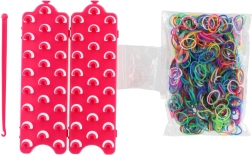 - 600 bandas de silicona (surtido de colores), telar de tres hileras, aguja de ganchillo, cierres, manual