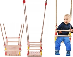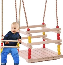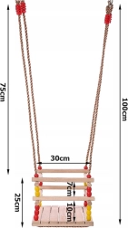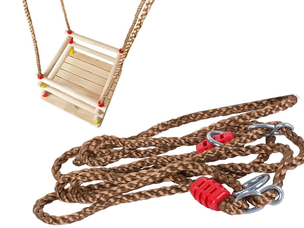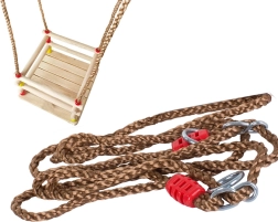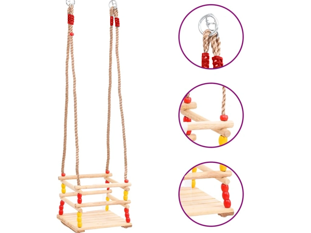 Las cuerdas trenzadas fuertes con anillas y herrajes garantizan la estabilidad y seguridad. Sus dimensiones compactas ahorran espacio y el columpio se transporta o guarda fácilmente. Las cuentas de colores aportan un aspecto divertido y los niños se enamorarán pronto del columpio.