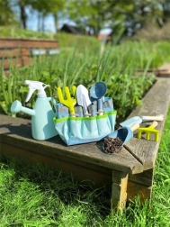 La bolsa, ligera y portátil, ofrece espacio suficiente, sujeciones elásticas para las herramientas y transporte sencillo. El juego está adaptado a las manos infantiles, por lo que trabajar en el jardín, en bancales elevados o en el arenero resulta natural y divertido. Los materiales resistentes soportan el uso diario y diferentes superficies.