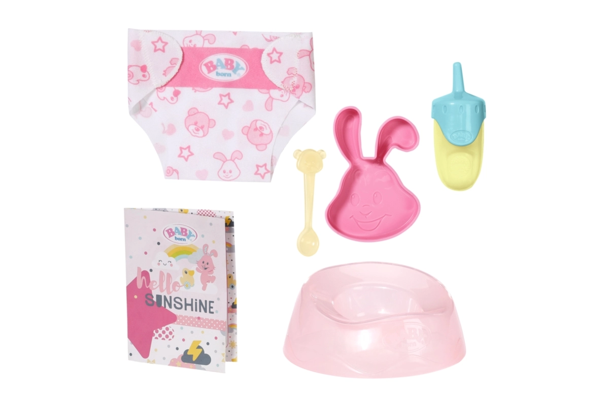 - Accesorios incluidos: biberón, chupete con cinta, pañal, platito, cucharita, orinal y otros complementos para el juego de cuidados.