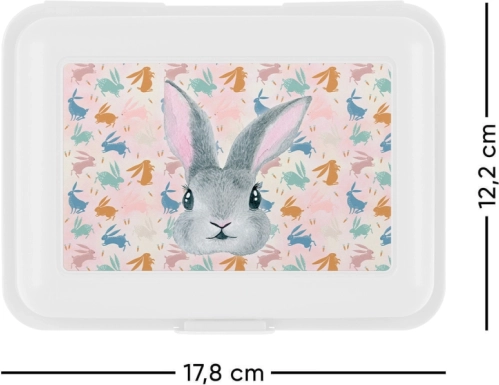 El diseño minimalista en color blanco se complementa con el encantador motivo Bunny, que encantará tanto a niños como a amantes de los detalles divertidos. La caja es ligera, fácil de transportar y cabe en la mochila escolar o el bolso.