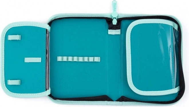 En el interior encontrarás dos compartimentos espaciosos para libros y cuadernos, un bolsillo delantero para la fiambrera y un bolsillito para pequeños objetos, ambos con cremallera. En los laterales hay un bolsillo abierto para la botella y un pequeño bolsillo con cremallera para acceso rápido. El fondo resistente protege el contenido de la suciedad y evita filtraciones de líquidos. El set incluye también una bolsa para gimnasia de 100% poliéster con cierre de cordón y un estuche de una sola capa con dos solapas y 25 gomas elásticas (sin contenido), con lámina transparente para el horario.