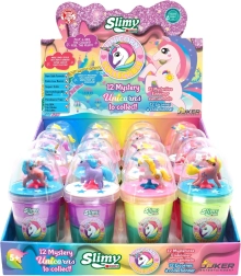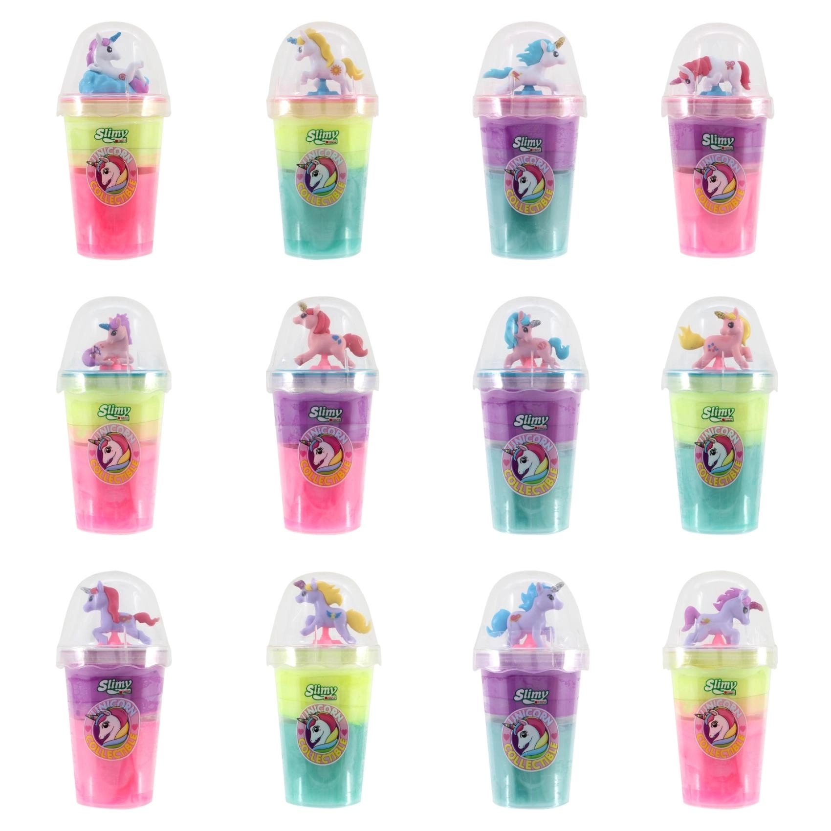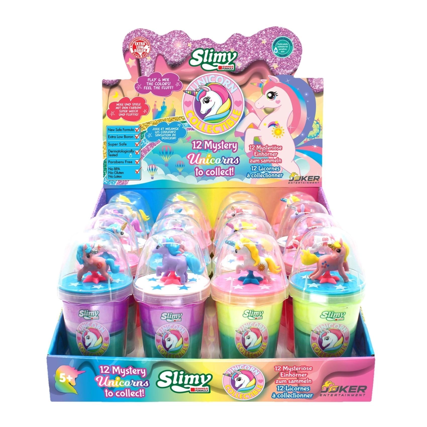 Da rienda suelta a la imaginación con el slime original Slimy, que combina el placer de apretar, estirar y moldear con figuras de unicornios de colores adorables. Cada vasito ofrece una combinación de colores distinta y un soporte estable, para que los niños puedan exhibir su figura o integrarla en el juego.