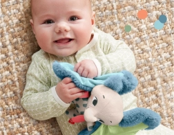 Las orejas grandes y esponjosas con detalles de satén invitan a apretar, acariciar y explorar distintas superficies, ideales para desarrollar el tacto y calmar a la hora de dormir.