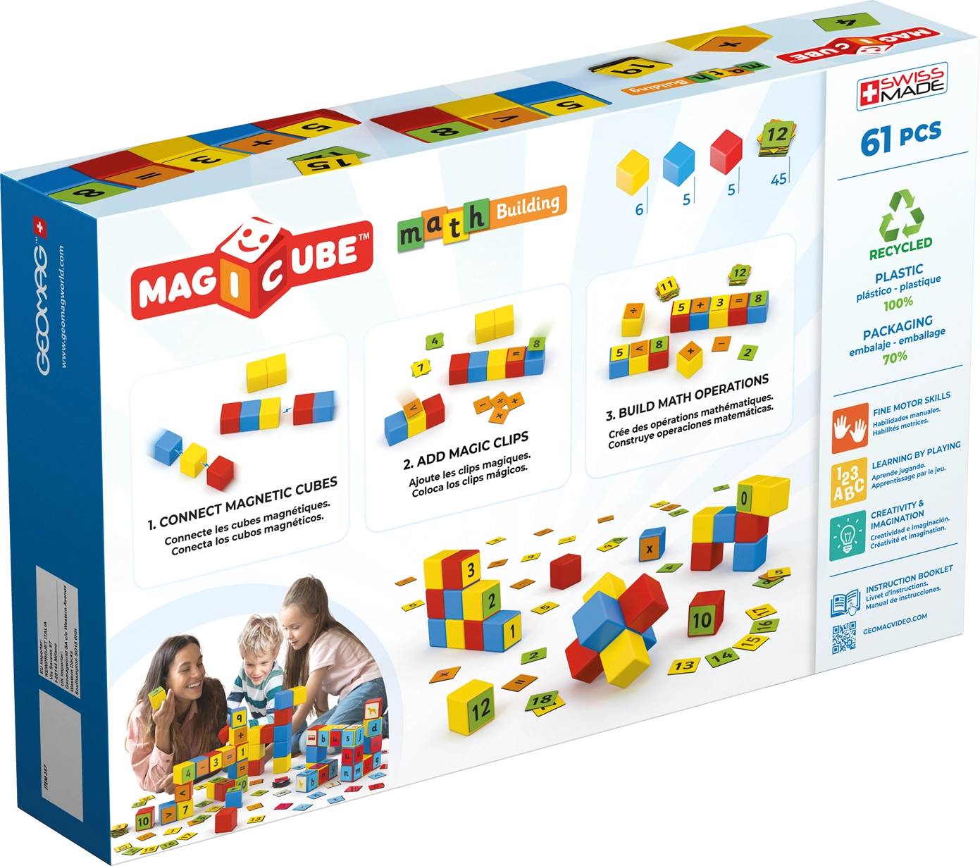 El set matemático Geomag Magicube une diversión y aprendizaje. Los cubos magnéticos se atraen por todos los lados, de modo que los niños construyen fácilmente formas, torres y sencillas estructuras 3D mientras practican el cálculo. Gracias a los clips de doble cara con números y símbolos, ejercitan jugando la suma, la resta y la tabla de multiplicar.