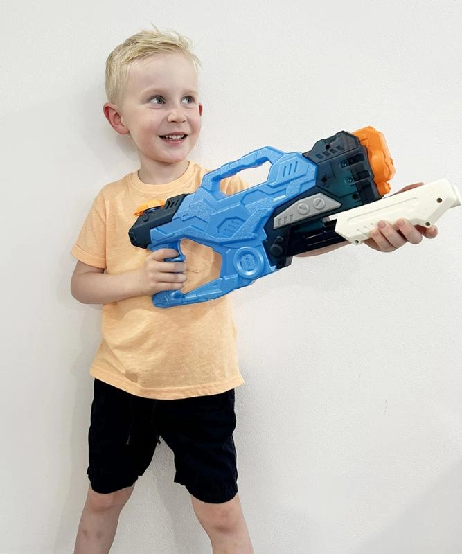 Una dispersión más amplia y un chorro de agua más potente te darán ventaja en cualquier batalla acuática. Ideal para un juego dinámico en el jardín y cerca del agua.