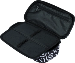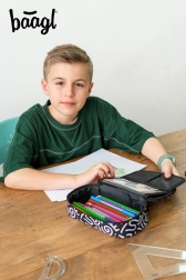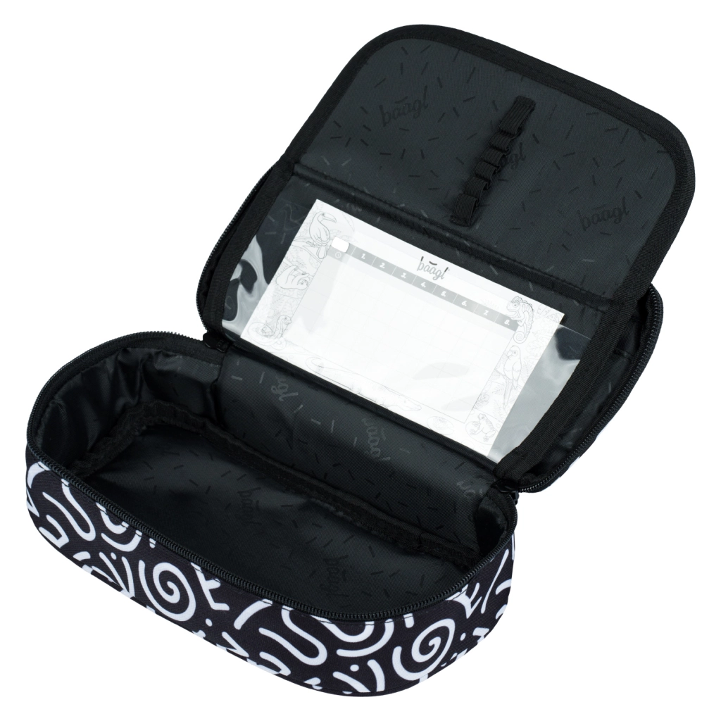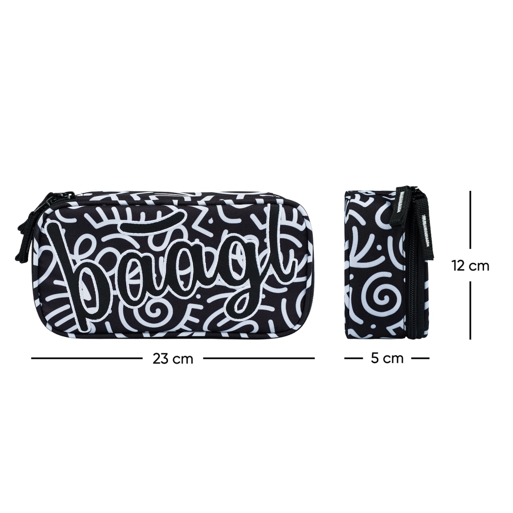 El estuche presume de un aspecto textil en blanco y negro con patrones abstractos y la inscripción 'Baagl'. Su diseño estiloso es ideal para quienes cuidan la moda también en el material escolar.