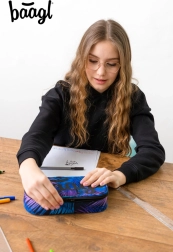Con un patrón en azul y violeta y el logotipo de baagl, este estuche combina estética moderna y funcionalidad en uno.