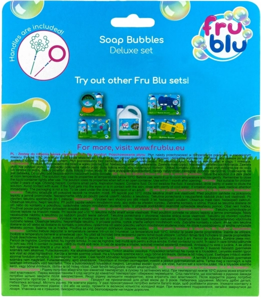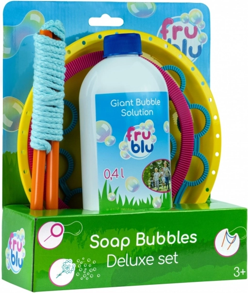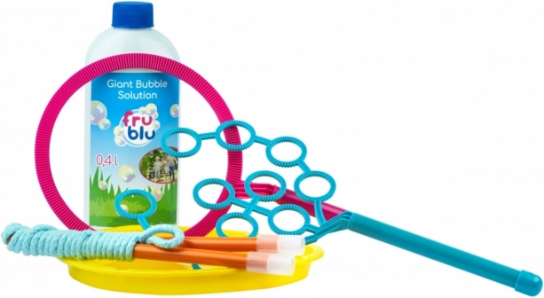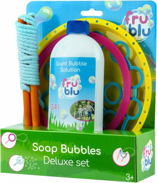 El set deluxe de burbujas FRU BLU con solución de 0,4 l ofrece una solución compacta y fácil de almacenar para crear burbujas pequeñas y gigantes. Gracias al montaje sencillo, a los 3 accesorios intercambiables y a la solución incluida de 0,4 l, niños y adultos disfrutarán de máxima diversión al aire libre en fiestas y a diario.