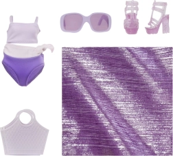 Los accesorios incluyen ropa violeta, gafas de sol, zapatos y un pequeño bolso, lo que permite diversas variaciones de moda y temas como la playa o el verano.