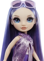 La muñeca tiene un largo cabello violeta que combina perfectamente con sus grandes ojos azules. Un conjunto brillante y elegante junto con gafas de sol violetas aporta un tema de moda al juego.