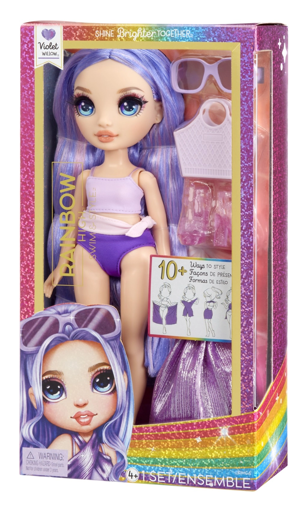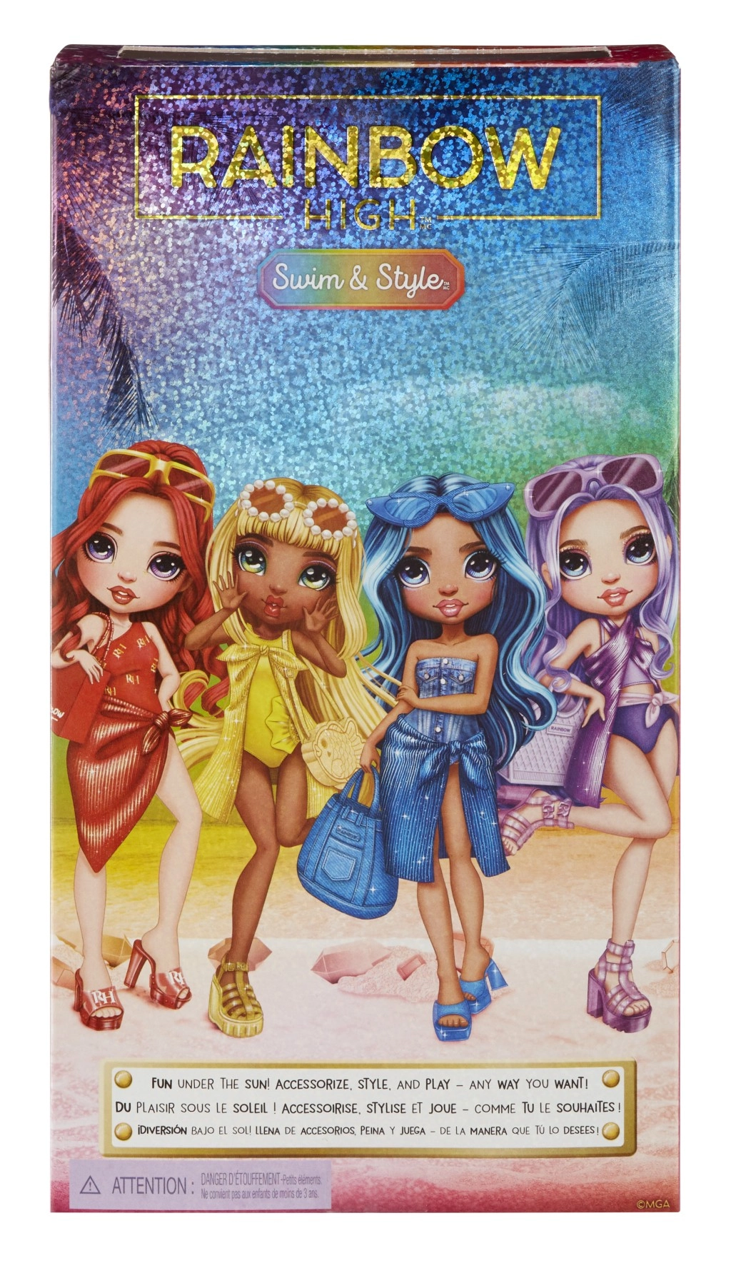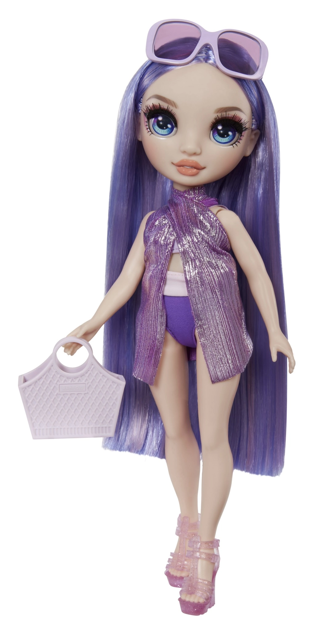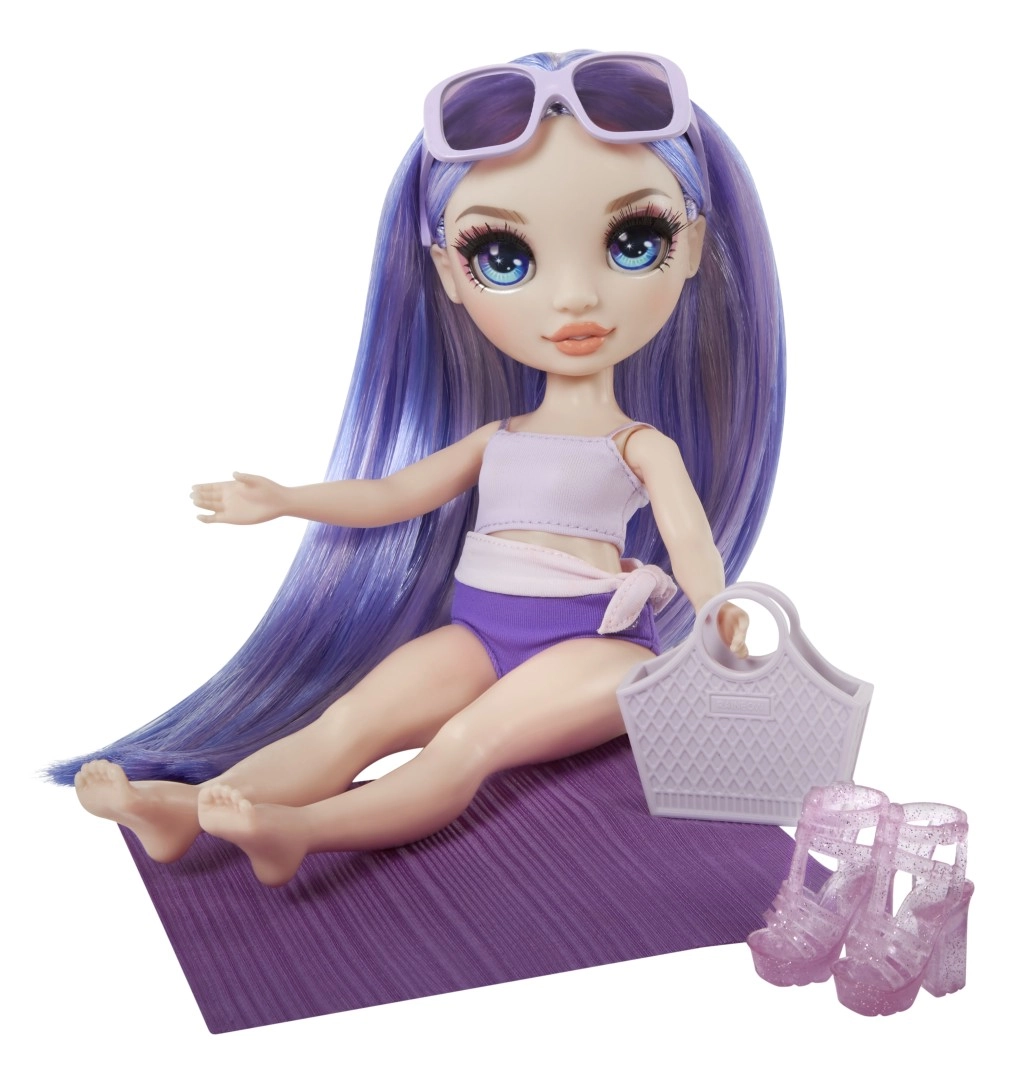 La muñeca Rainbow High Estilo de Playa en color violeta está lista para aventuras veraniegas. Viste un precioso conjunto de baño y está equipada con accesorios que subrayan su estilo único. La colección Rainbow High Swim & Style ofrece más de 10 estilizaciones diferentes que se pueden combinar y coleccionar.