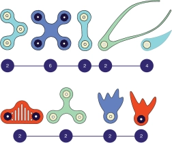 Piezas multidireccionales con rotación de 360° y fijación en 24 posiciones que se mantienen firmes y permiten construir estructuras 2D y 3D estables.