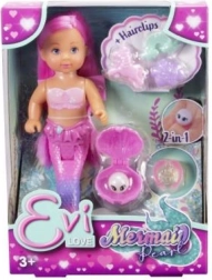La muñeca Evi como sirena perlada encantará a los niños con su cola morada y sus largos cabellos rosados, que pueden peinarse con los pasadores incluidos en forma de nube, arcoíris y unicornio. También incluye una perla mágica, que se puede colocar en un anillo infantil y convertirla en una joya encantada.