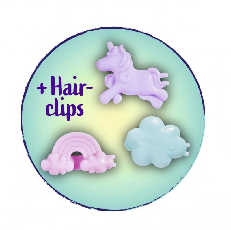 Evi tiene largos cabellos rosados y coloridos pasadores con forma de nube, arcoíris y unicornio para peinados infinitos.