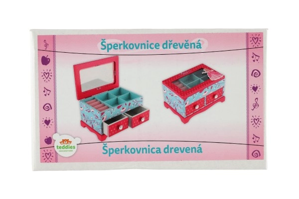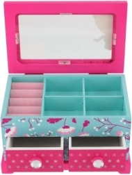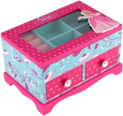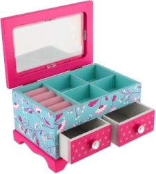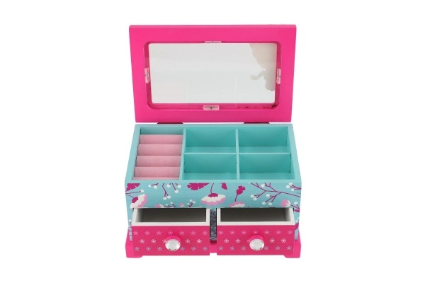 Elegante joyero infantil de madera de alta calidad con tapa abatible y dos cajones, ideal para guardar joyas y pequeños tesoros. Destaca por su diseño colorido con motivos florales y de pajaritos en combinación rosa y azul, adornado con motivo de princesa. La distribución interior práctica y el espejito integrado facilitan el uso diario en la habitación infantil.