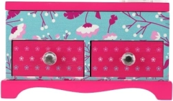 La superficie del joyero está decorada con delicados motivos florales y de pajaritos en tonos rosa y turquesa, que complementan maravillosamente cualquier habitación infantil. Gracias a su robusta fabricación en madera y a los tiradores suaves, los niños pueden manipularlo cómodamente. No es un juguete: apto como objeto decorativo y de almacenamiento.