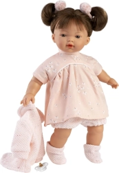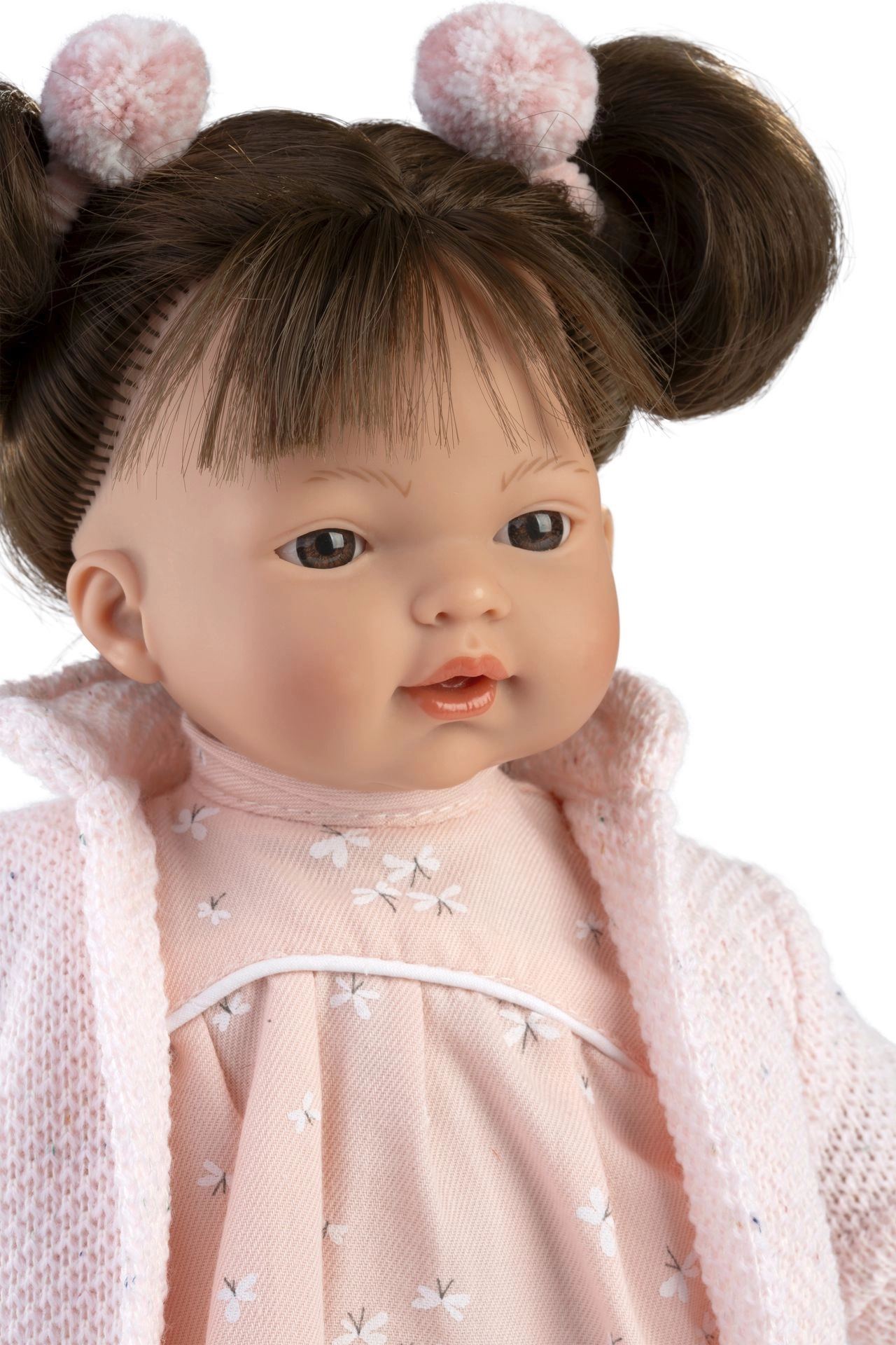 Llorens Vera es una muñeca infantil pensada para un juego cariñoso y el desarrollo de la imaginación. Tiene un cuerpo de tela suave ideal para abrazar y vinilo suave en la cabeza y las extremidades con finos detalles. Cabello por toda la cabeza que invita a peinar y crear peinados. Al retirar el chupete comienza a hablar (“mamá”, “papá”) y a llorar de forma realista; el chupete magnético silencia los sonidos al instante.