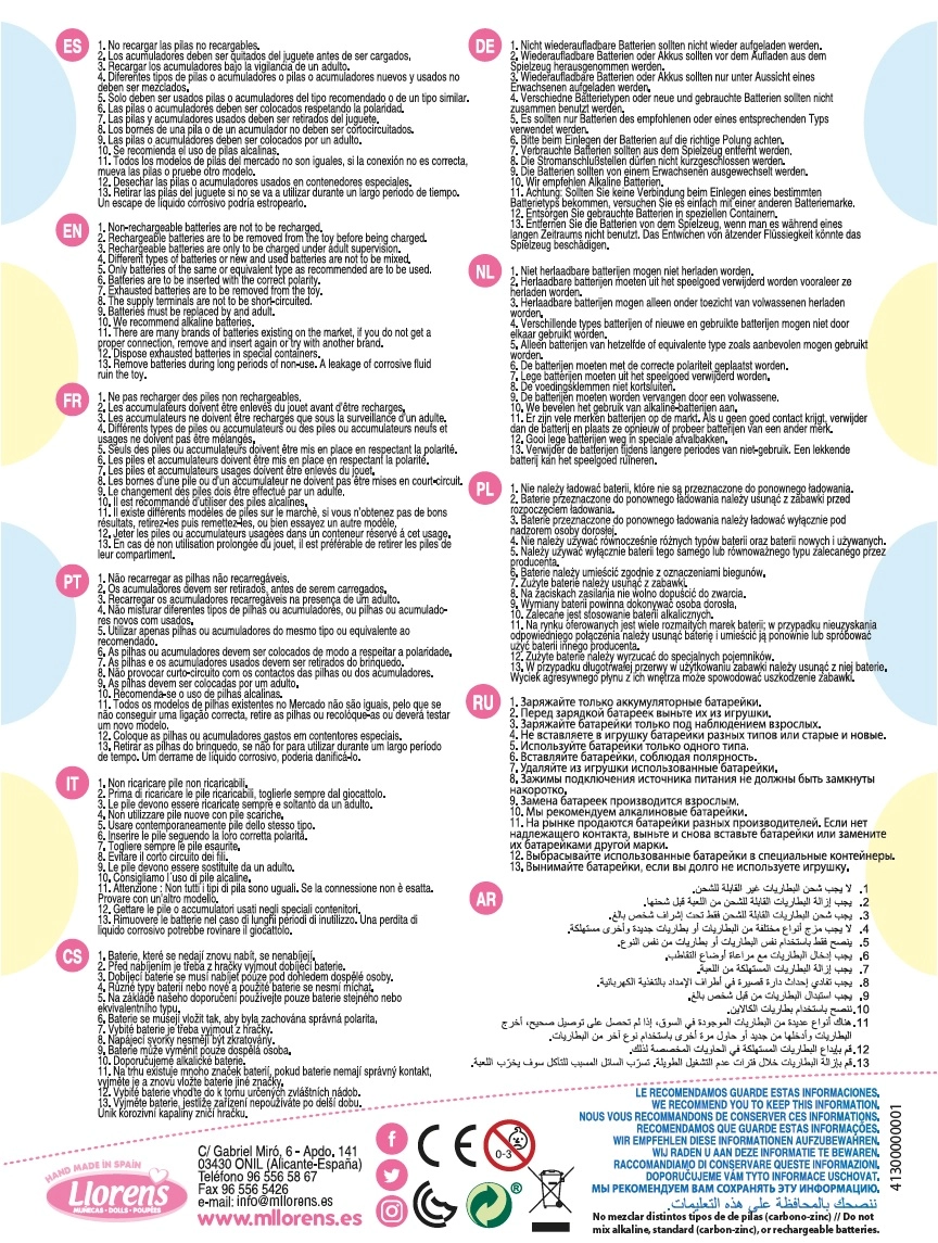 La muñeca está hecha a mano en España, llega en una caja de regalo y está lista para usar tras retirar el seguro. El paquete incluye 3× pilas de botón LR44 y las instrucciones para su sustitución. Para ampliar el juego, se puede comprar ropa original Llorens para tamaño 33 cm.