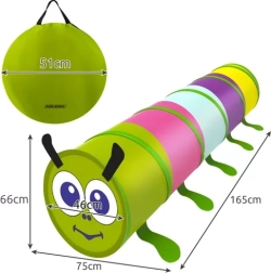Colores alegres y forma de oruga que estimulan la fantasía, fomentan el juego activo, el gateo y el escondite.