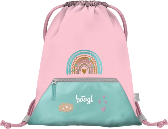Práctica bolsa escolar BAAGL para calzado y actividades de ocio en un elegante diseño rosa Arcoíris. Ofrece material resistente y lavable, bolsillo con cremallera en la parte inferior y cierre mediante cordones resistentes, que permiten llevarla cómodamente a la espalda. Gracias al mosquetón se puede enganchar fácilmente a la cartera.