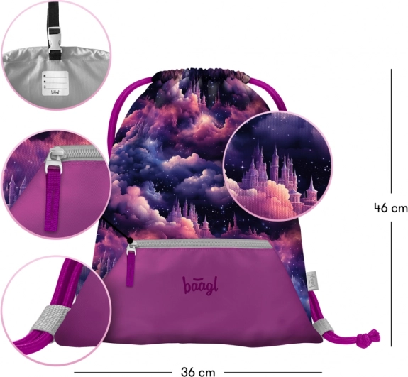 La elegante bolsa Baagl con el motivo Reino del Unicornio es una gran opción para la escuela, actividades y deporte. Gracias a su material resistente y lavable, soporta el uso diario y se limpia con facilidad. El bolsillo frontal con cremallera ofrece un espacio seguro para pequeños objetos, llaves o pañuelos.
