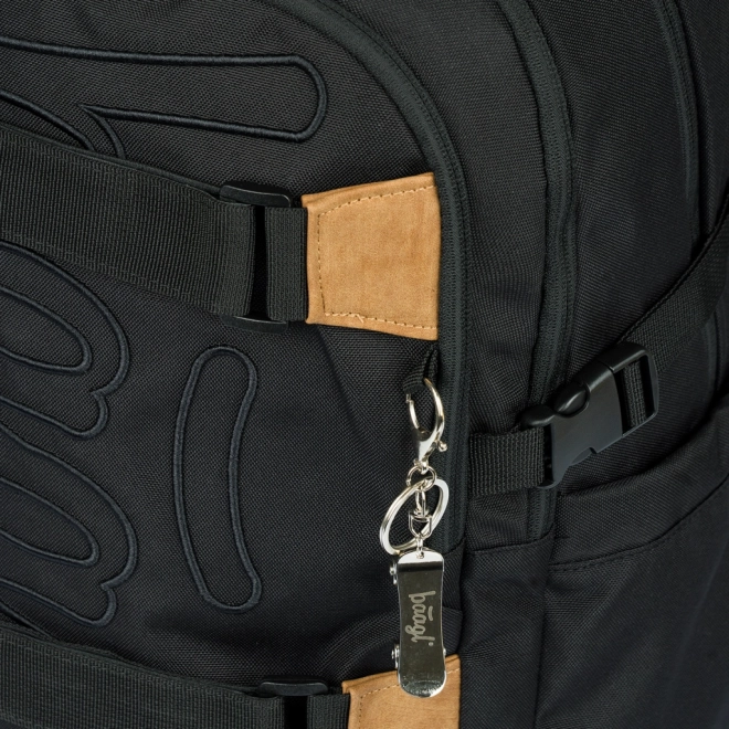 Dos correas frontales para sujetar el skateboard, material resistente e impermeable y fiables cremalleras YKK. Incluye además un colgante metálico con forma de tabla.