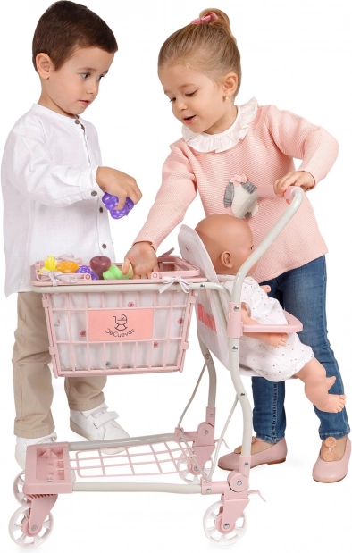 El adorable carrito de la compra infantil 2 en 1 de la colección KOALA combina un gran carrito con asiento para muñeca y una cesta de mano extraíble. Incluye 12 piezas de fruta de plástico, ruedas delanteras giratorias, frenos traseros y espacio de almacenamiento en la parte inferior. Manejo ligero, acabado de calidad y un diseño delicado que encantará a cualquier pequeña vendedora.