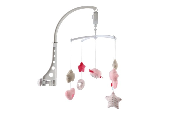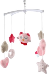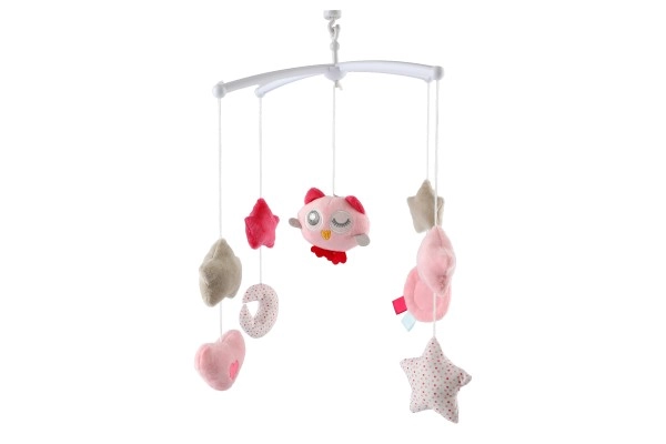 El móvil musical rosa para cuna con buhito aporta calma y sensación de seguridad al bebé. Los elementos colgantes de tacto suave con forma de estrellitas, corazones y luna se balancean delicadamente, mientras el mecanismo de cuerda reproduce una melodía agradable. Su funcionamiento silencioso y los colores pastel, visualmente acogedores, favorecen un ambiente relajante antes de dormir.