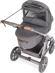 La goma sobre la capota y los cordones con topes permiten fijar la sombrilla fácilmente a la mayoría de carritos y ajustarla a las condiciones del momento.