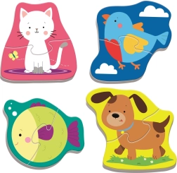 Un colorido set de rompecabezas infantiles TREFL BABY con motivos de animales domésticos que encantará a los más pequeños desde 1 año. Contiene 4 mini puzzles sencillos (gato, perro, pez, pajarito) de cartón resistente y seguro. Las piezas grandes encajan perfectamente en las manitas, fomentan la motricidad fina, el pensamiento lógico y el aprendizaje de los nombres de los animales. El empaque portátil con asa es práctico para casa y para viajes.