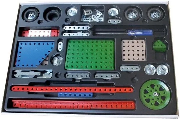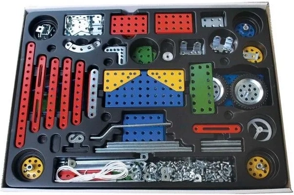 Descubre el desarrollo de las capacidades creativas de tu hijo con este clásico juego de construcción de dos capas Merkur, que ofrece la posibilidad de montar hasta 40 modelos diferentes. Este set incluye 609 piezas metálicas y componentes necesarios para ensamblar modelos como vehículos de carga, fórmulas y aviones.