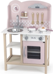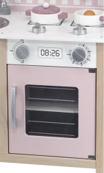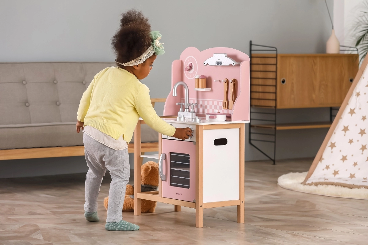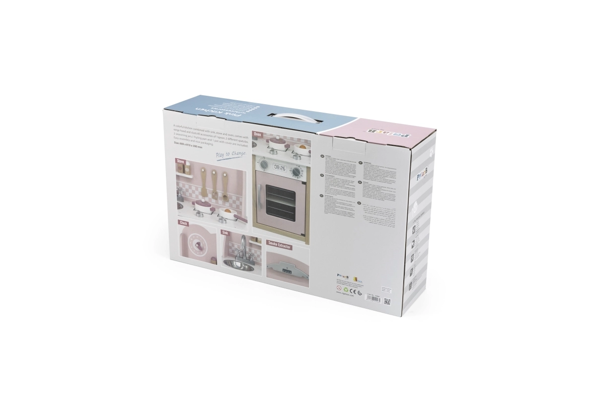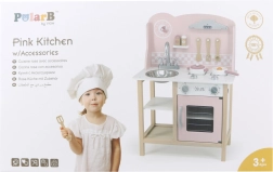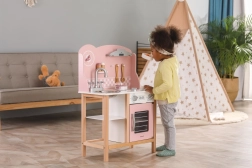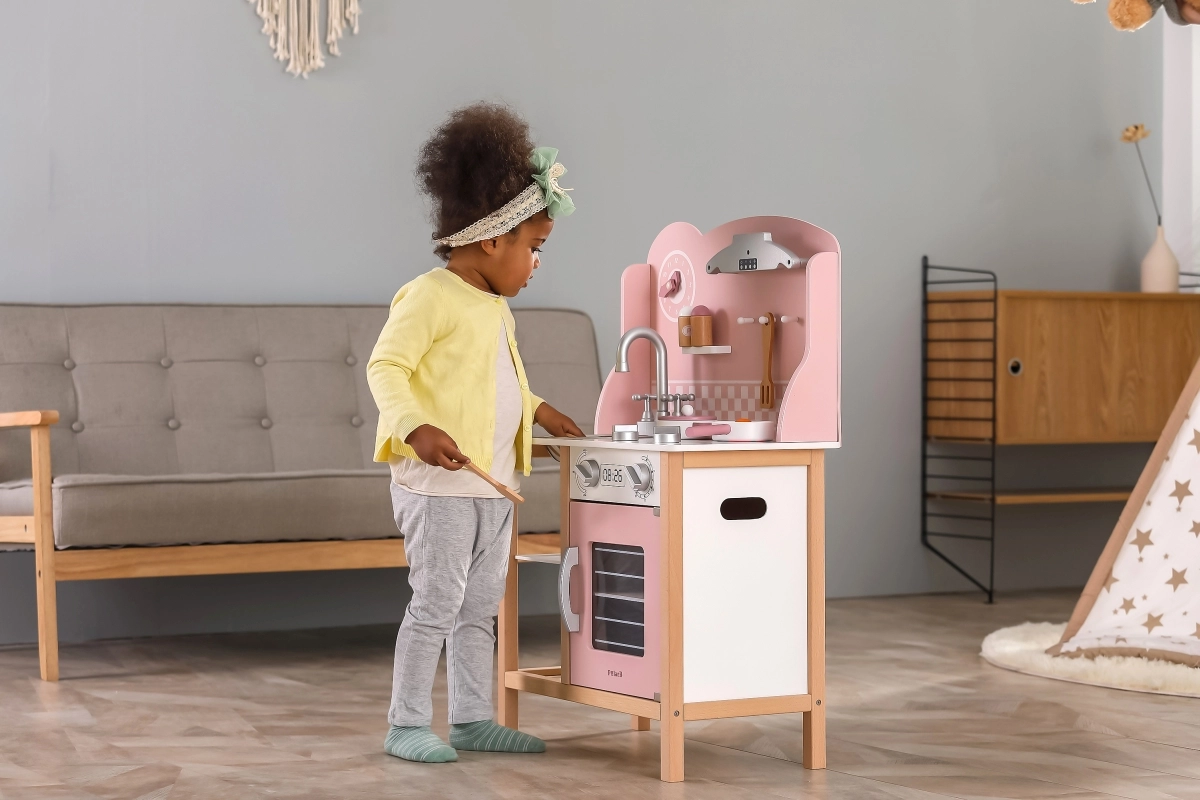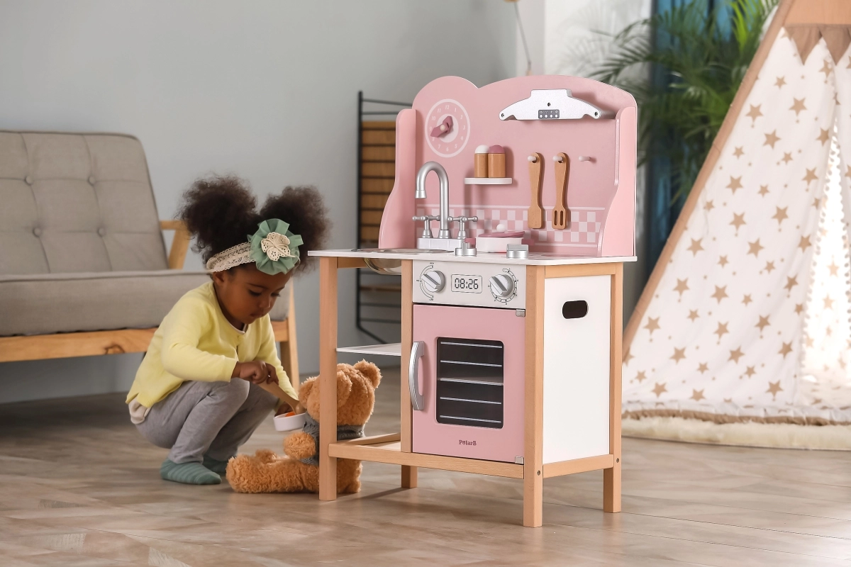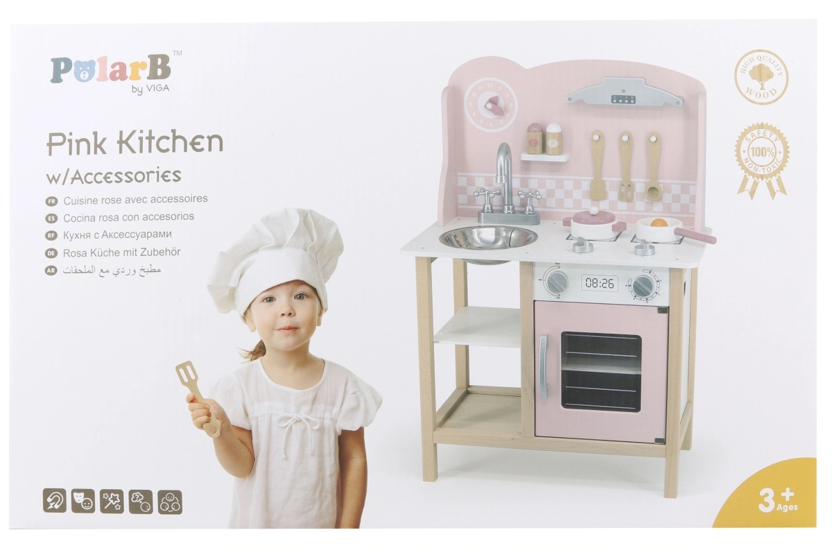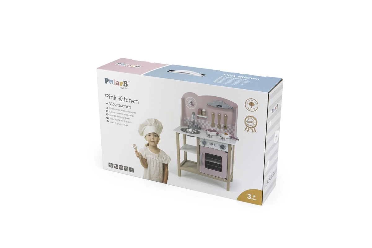 La cocina infantil VIGA PolarB en delicada combinación rosa y blanca fomenta el juego creativo, la autonomía y las habilidades sociales. Gracias a sus elementos realistas —desde el fregadero con grifo hasta el horno con puerta y los mandos giratorios con característico “clic”— los niños podrán experimentar qué se siente al cocinar, hornear y ordenar como los adultos. La estructura de madera con bordes suaves y superficie tratada con pinturas seguras y no tóxicas garantiza una larga vida útil y seguridad durante el juego.