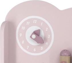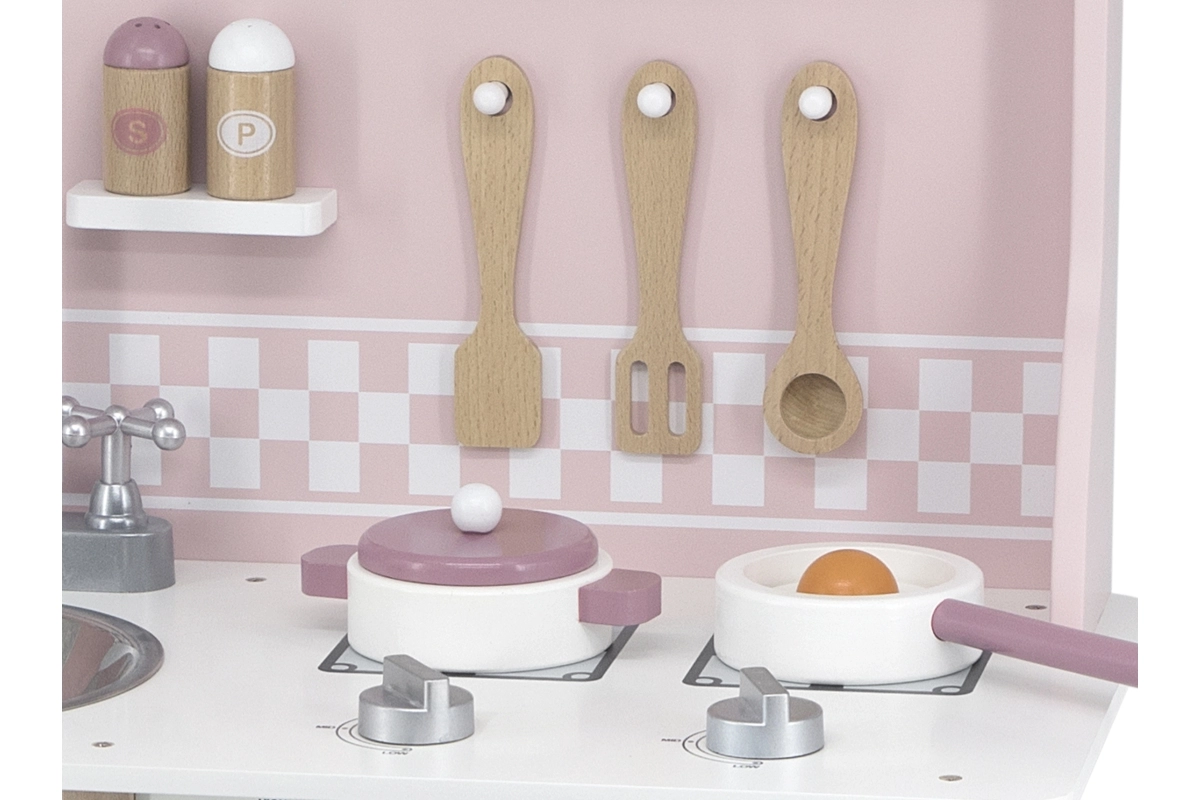 También incluye un práctico espacio de almacenamiento con estante, ganchos colgantes para los utensilios y reloj para aprender el tiempo de forma divertida. El completo set de accesorios —olla con tapa, sartén con huevo frito, cuchara, espátula perforada, espátula lisa, salero y pimentero— permite a los niños preparar un “menú” para toda la familia.