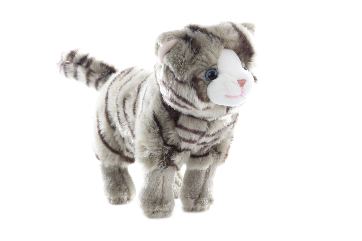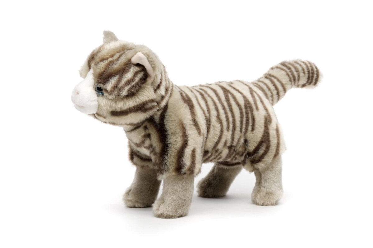 El peluche suave con sutiles rayas y ojitos azules luce verosímil e invita a los abrazos.