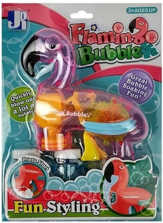Este divertido set para hacer burbujas consta de una pistola con forma de flamenco y dos botellitas con solución de repuesto. Simplemente desenrosca la tapa de la botella, retira la protección y enróscala en la pistola. Basta con presionar el gatillo y empezarán a salir hermosas burbujas de colores.