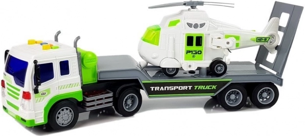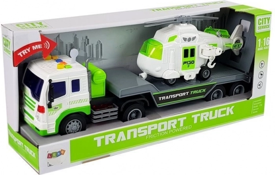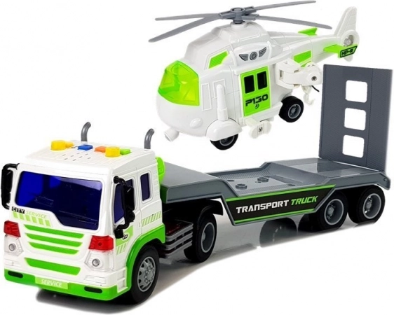 Este camión de transporte detallado en blanco y verde cuenta con una plataforma larga para cargar cómodamente el helicóptero u otros vehículos. La rampa trasera abatible facilita el acceso y el asegurado de la carga. La diversión está garantizada con efectos de luz y sonido: en el techo de la cabina encontrarás 4 botones para el arranque del motor, la bocina, el sonido de conducción y el de marcha atrás. Gracias a la tracción por fricción basta con tirar del camión hacia atrás y soltarlo.